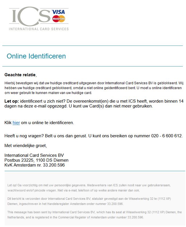 Verder is de naam van de afzender gewoon International Card Services, echter is het mailadres in dit geval [email protected]. Wat uiteraard de tweede rode vlag laat wapperen. Bijzonder is dat het telefoonnummer in de email echt bestaat en bijna hetzelfde is als dat van de ICS klantenservice, maar niet bestaat.